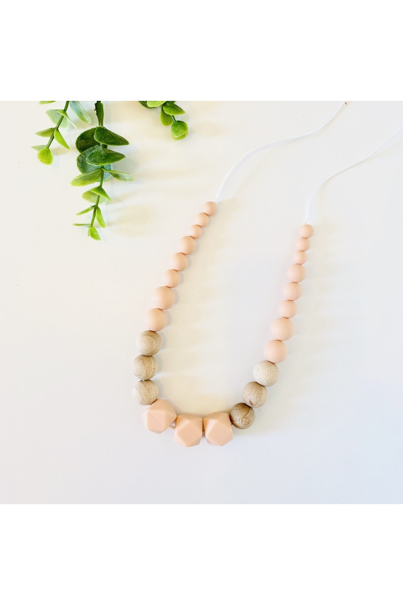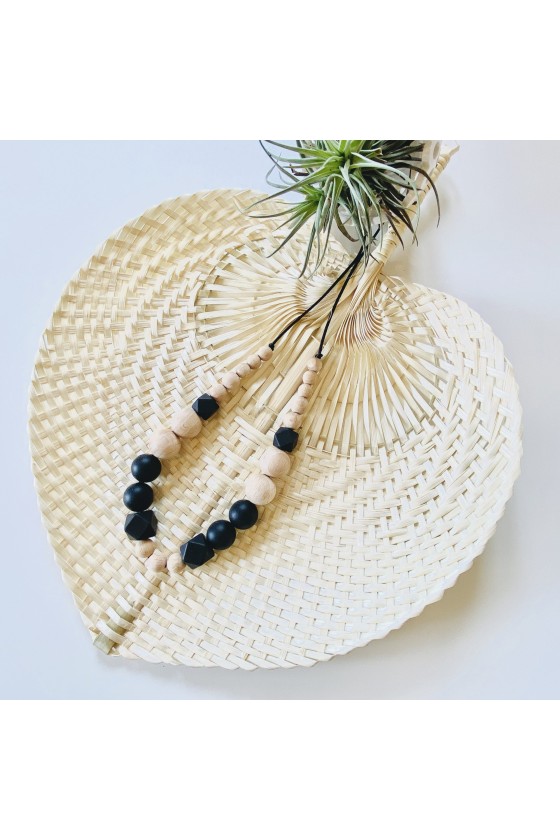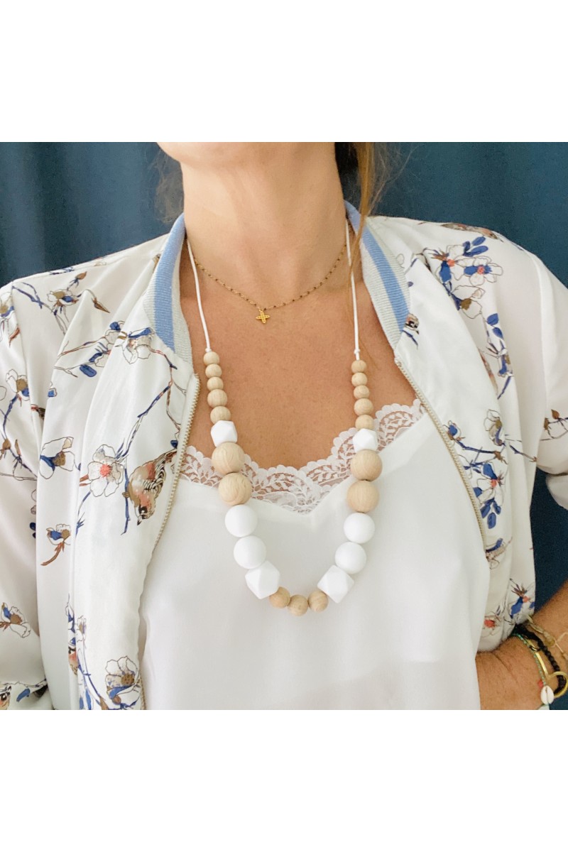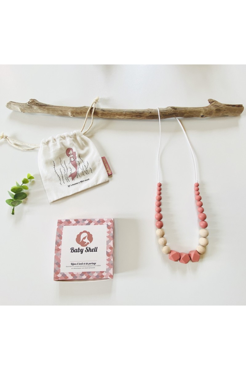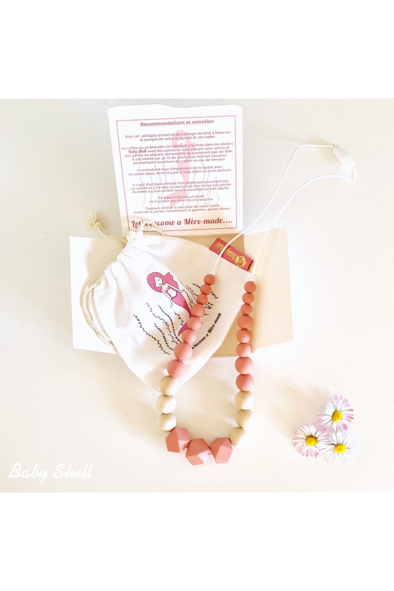 Ce collier est fabriqué à la main dans les ateliers Baby Shell avec des perles en bois de hêtre du Jura 🇫🇷, naturelles, sans vernis et des perles en silicone. Il est monté sur un fil de satin et un fermoir sécurisé permettant l’ouverture du collier en cas de tension dessus.