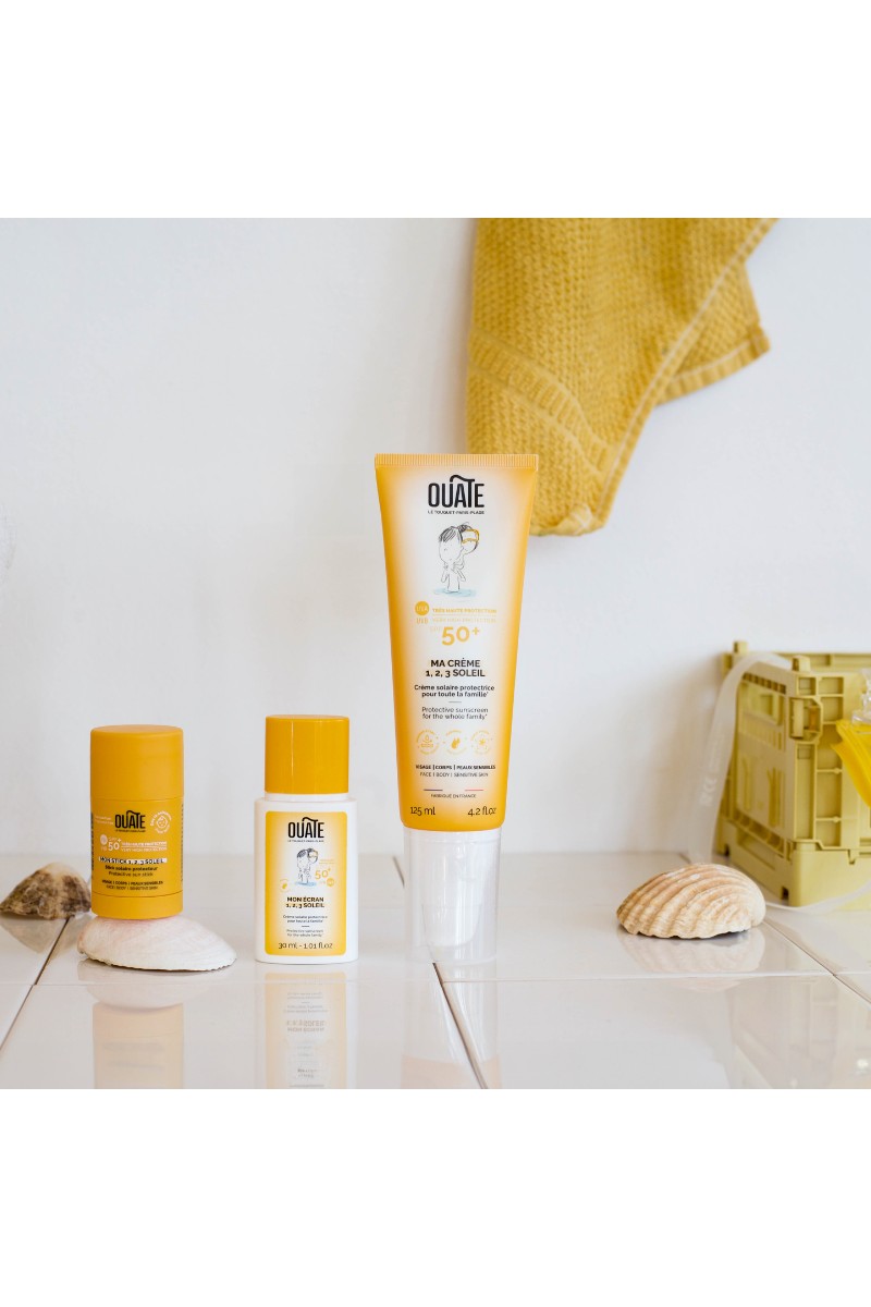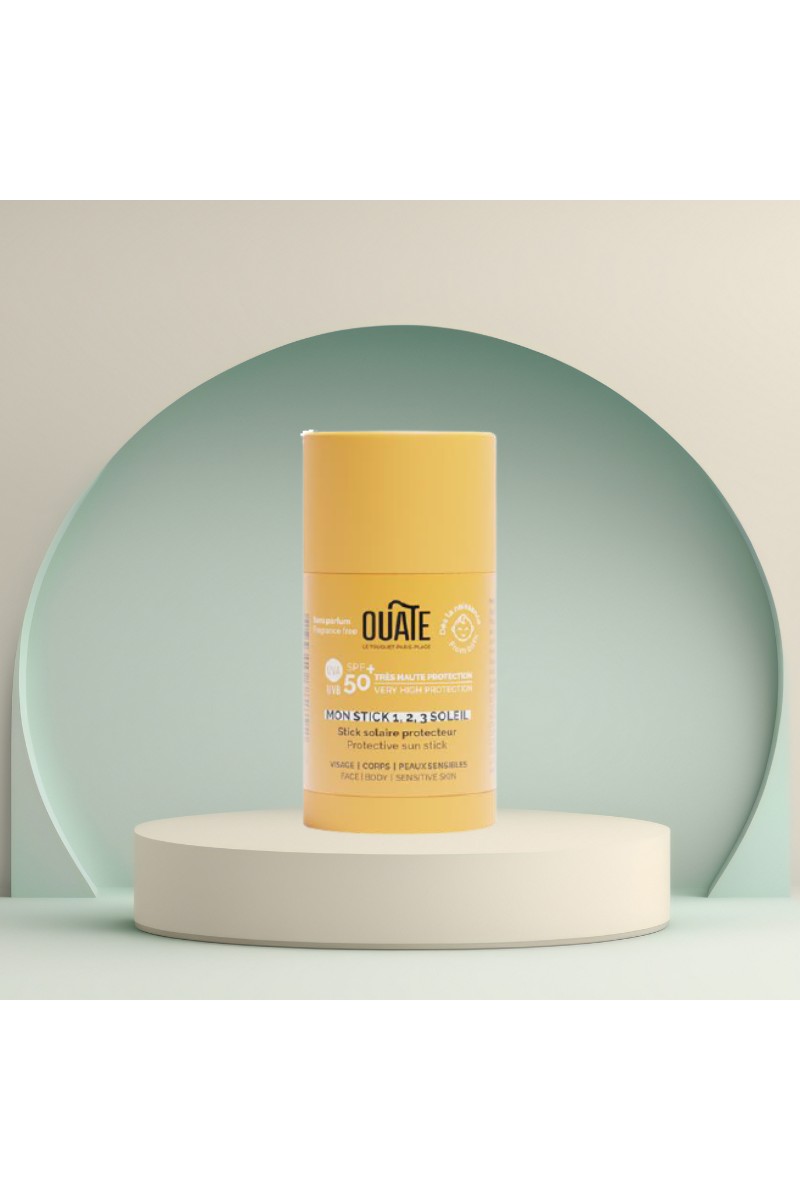 Le Stick Solaire OUATE protège efficacement la peau sensible des enfants grâce à sa haute protection SPF50+.